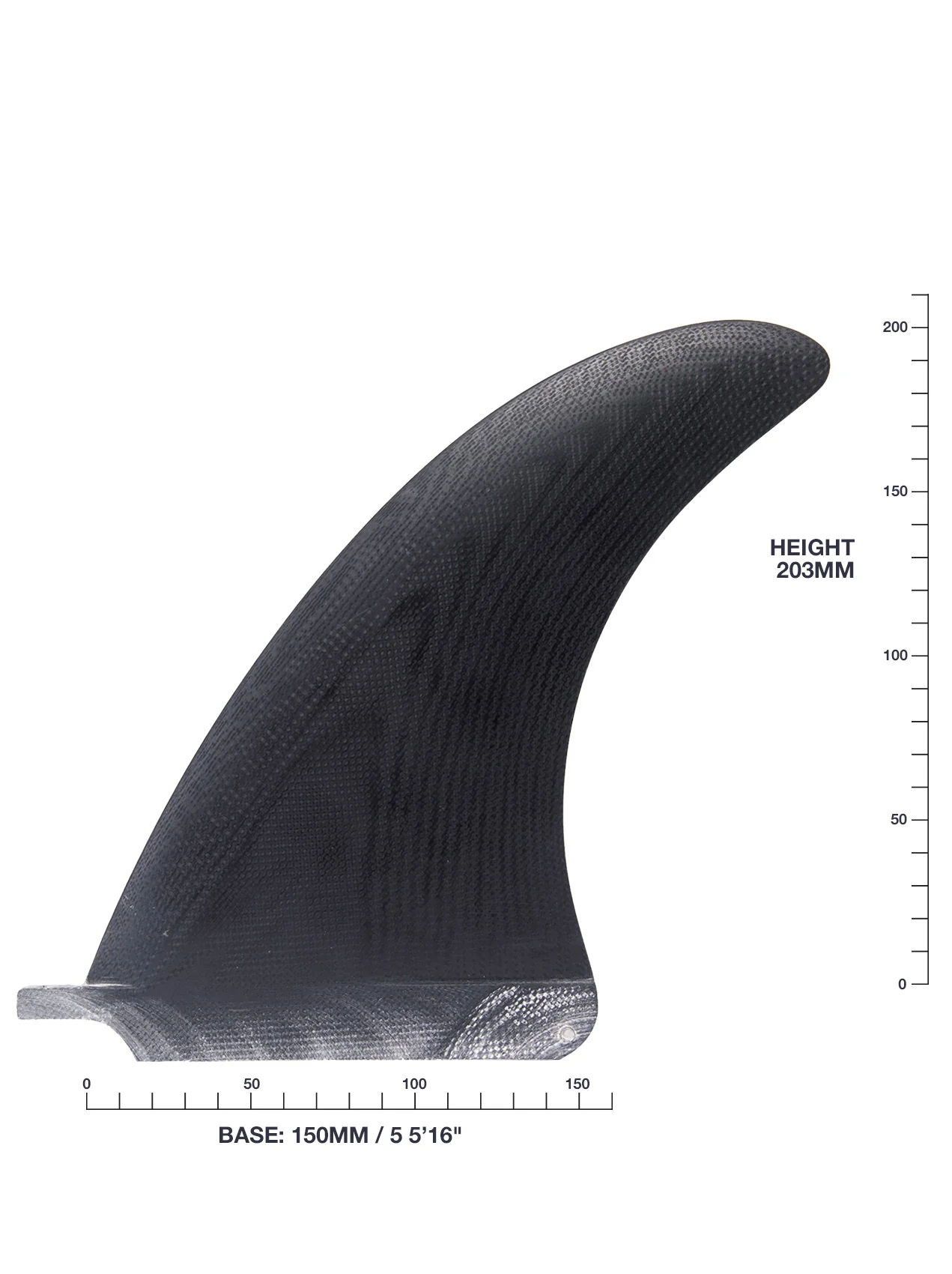 Simon Jones of Morning of the Earth Surfboards specifically designed this individually hand foiled fibreglass 8 inch Traditional Upright Single Fin for a solid, pivot feel in mid-length and shorter boards. The fin’s rigid-flex-pattern and base gives speed and drive while the tapered foiled finish through to the less flexible upright fin tip provides a very controlled feel when under speed and load in all conditions.